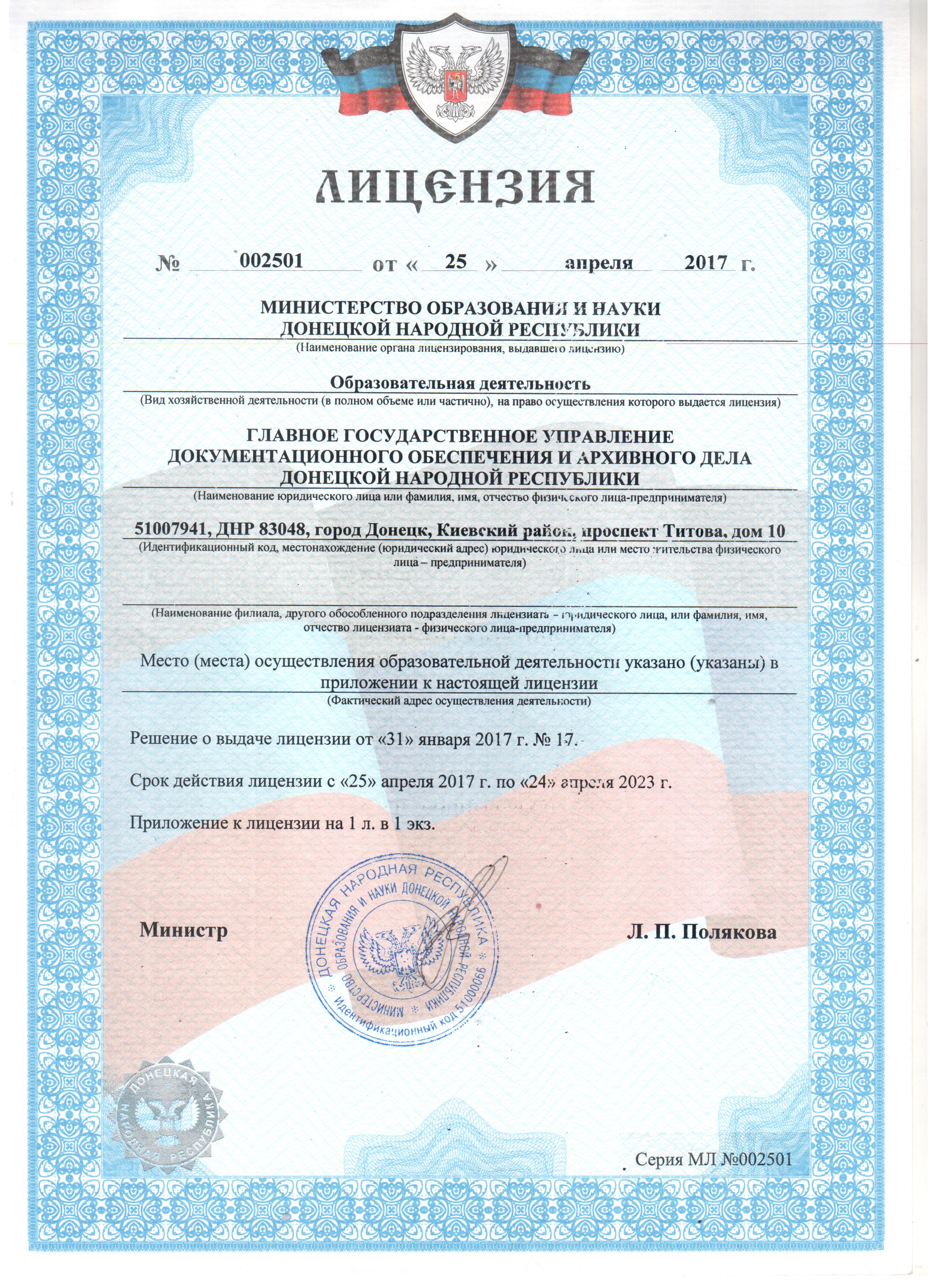 Главному государственному управлению документационного обеспечения и архивного дела Донецкой Народной Республики предоставлена лицензия на осуществление образовательной деятельности, выданная Министерством образования и науки Донецкой Народной Республики от 25 апреля 2017 года №002501.